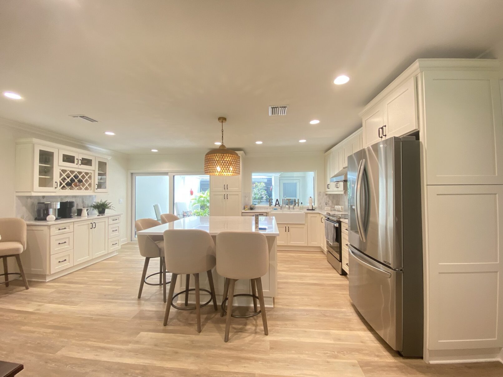 This ivory shaker-style kitchen bar is the perfect mix of classic charm and modern function. Glass panel doors showcase glassware beautifully, while soft under-cabinet lighting adds a warm, inviting glow. The black hardware provides a bold contrast, giving the space a refined yet timeless feel. Whether you’re mixing drinks or grabbing a quick coffee, this bar is designed for effortless style and convenience.